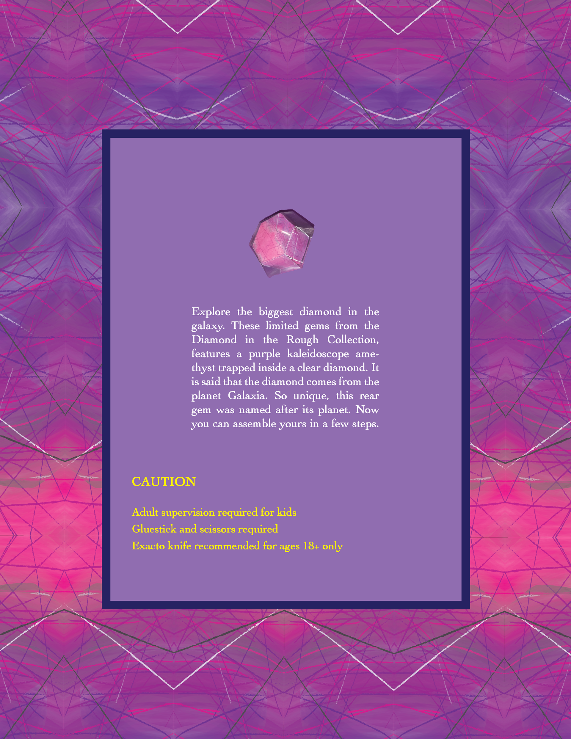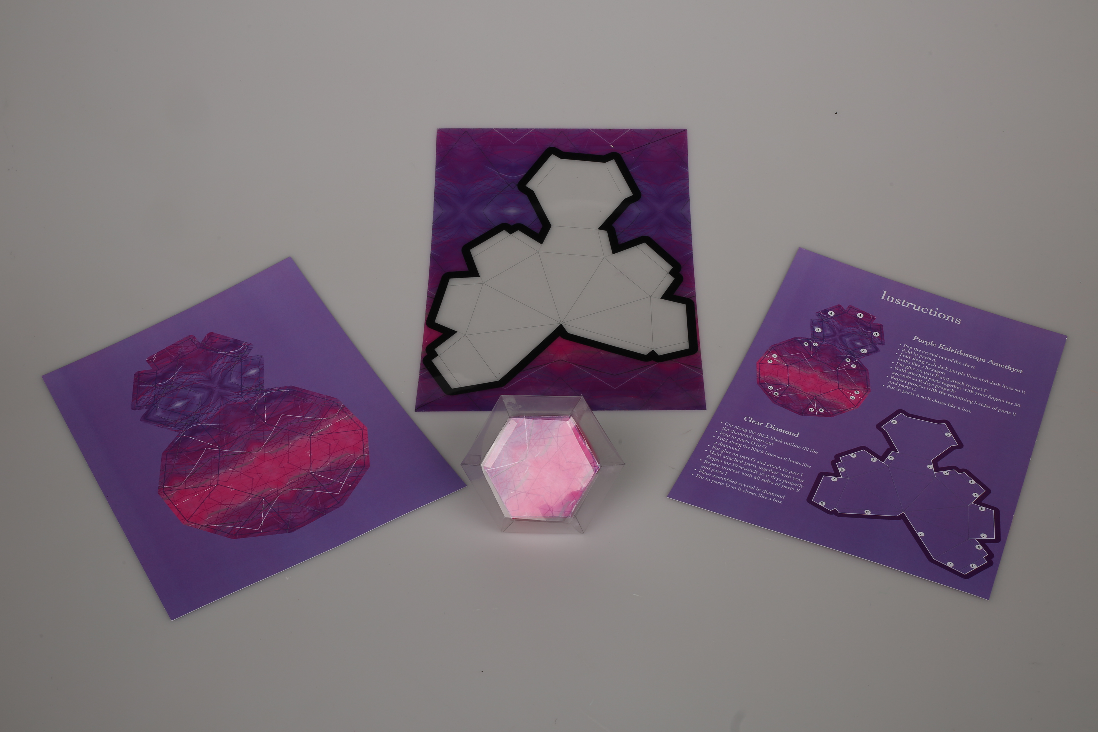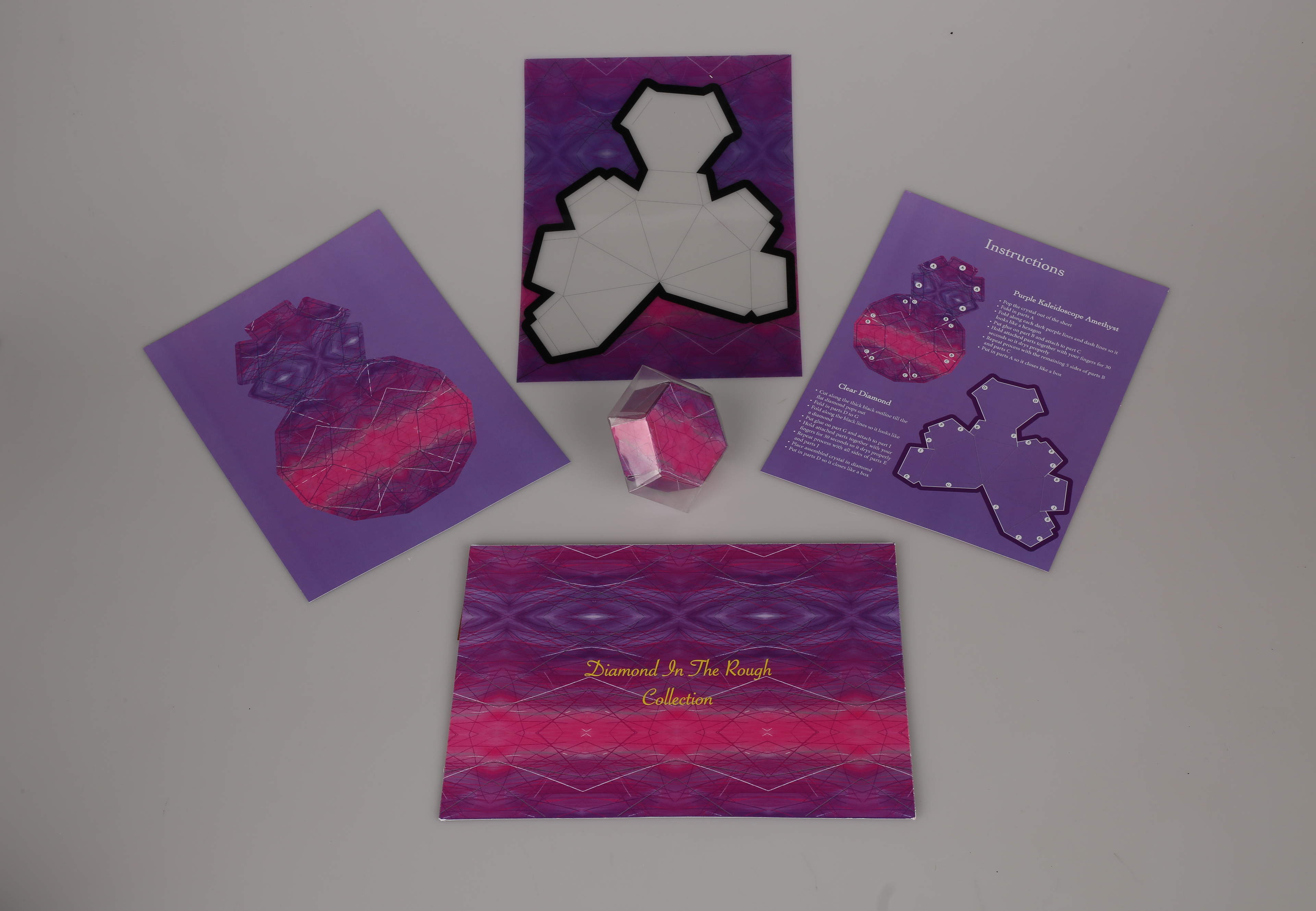 A 3D assemblage design concept: an collection for all ages, that comes with a clear diamond die-cut sheet, a purple kaleidoscope amethyst die-cut, and an instructions manual. glue, and adult supervision for younger kids required for assembling.