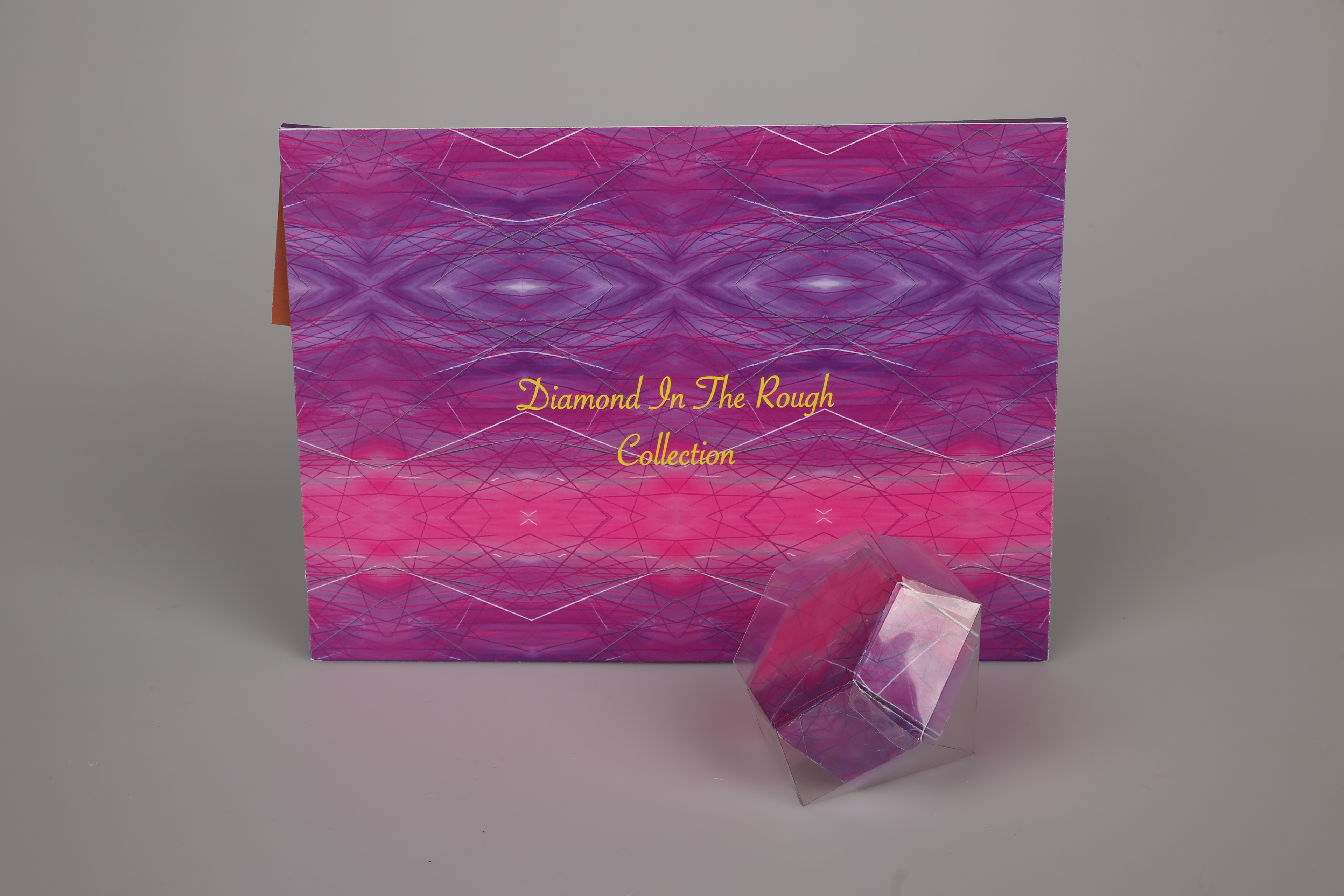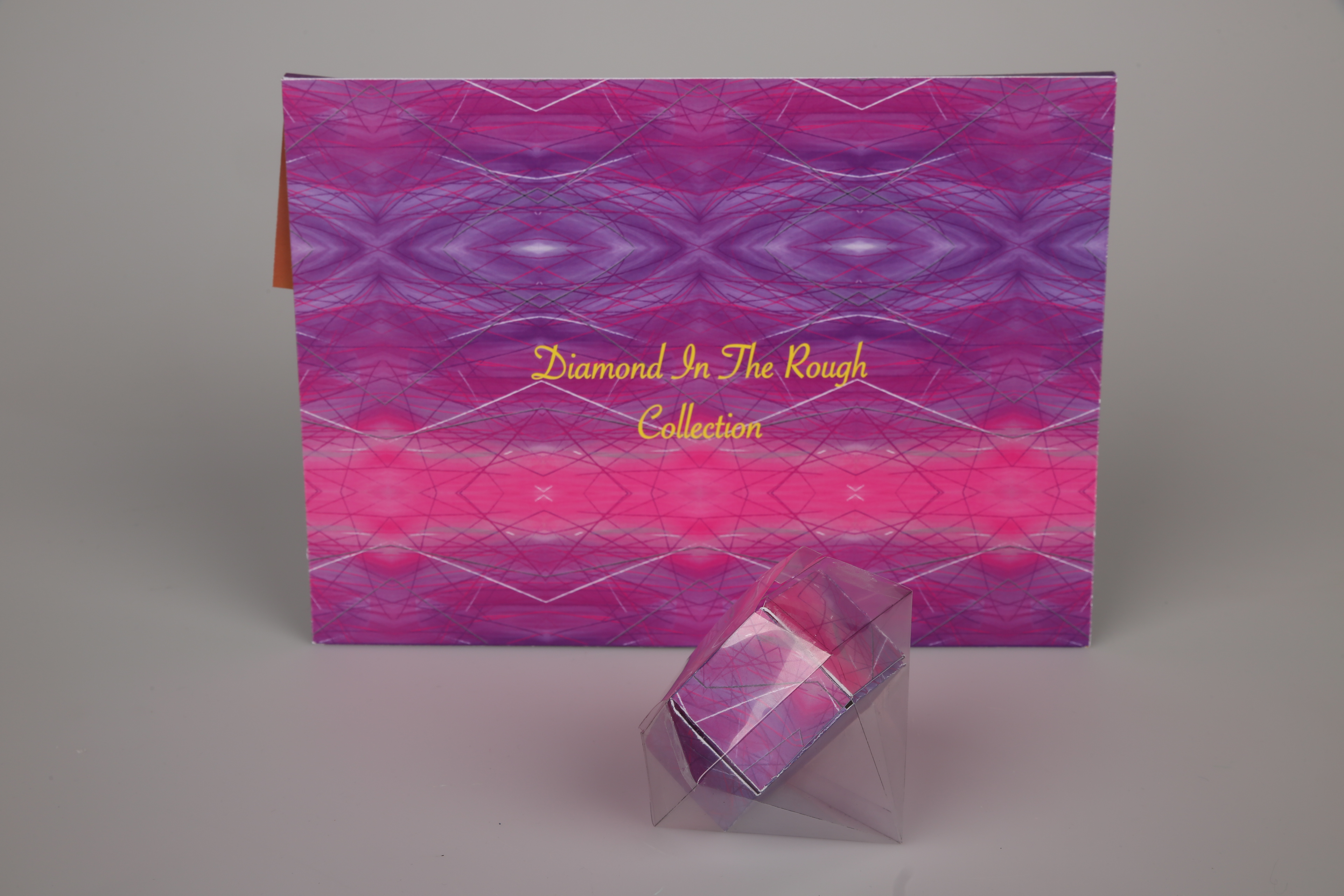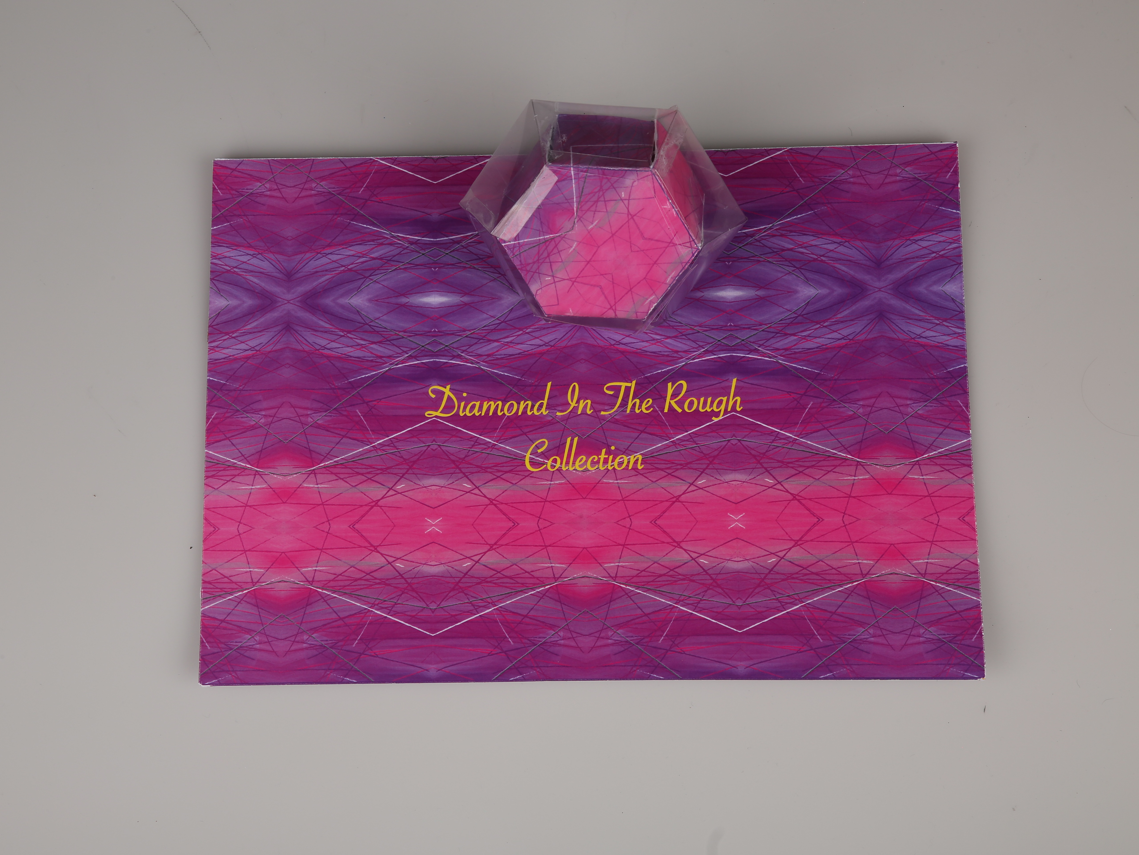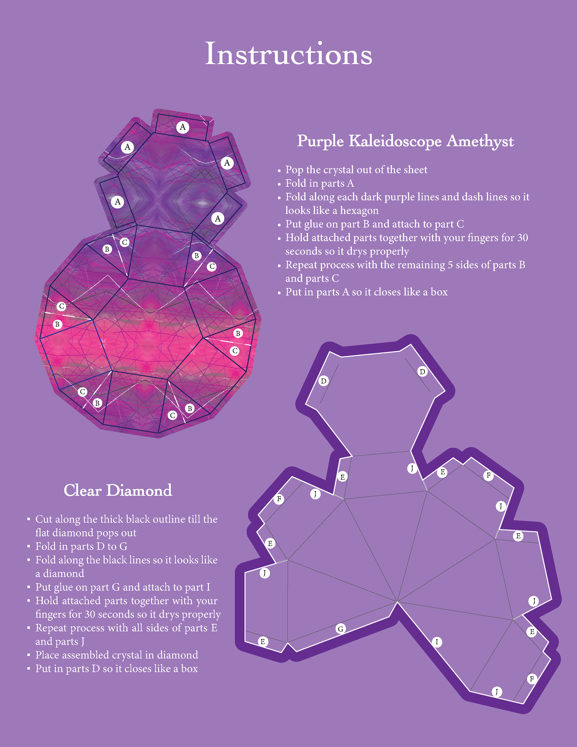 A 3D assemblage design concept: an collection for all ages, that comes with a clear diamond die-cut sheet, a purple kaleidoscope amethyst die-cut, and an instructions manual. glue, and adult supervision for younger kids required for assembling.